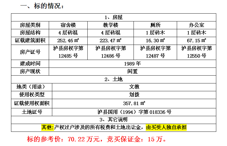 受瀘縣喻寺鎮(zhèn)人民政府委托,我公司將于2016年1月20日上午10時(shí)在瀘縣公共資源交易中心拍賣大廳公開拍賣瀘縣喻寺鎮(zhèn)廣東街(原喻寺鎮(zhèn)中心幼兒園)的房產(chǎn):