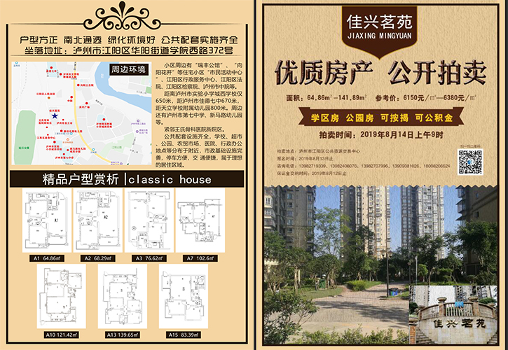 一、拍賣標(biāo)的:坐落于瀘州市江陽(yáng)區(qū)華陽(yáng)街道學(xué)院西路372號(hào)“佳興茗苑”小區(qū)第一批次住房。(詳見(jiàn)房屋清單)